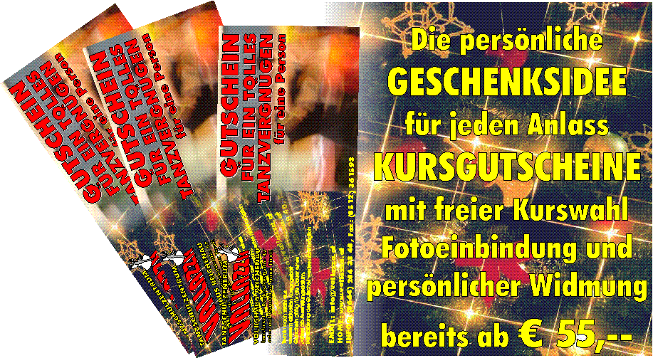 Unsere beliebte Geschenksidee für jeden Anlass erspart Ihnen nicht nur tagelanges Grübeln über das passende Geschenk und viel Lauferei. Die Möglichkeit der individuellen Gestaltung durch Einbindung eines Fotos der Beschenkten und/oder einer persönlichen Widmung macht unsere Kursgutscheine zu einem ganz individuellen Geschenk.