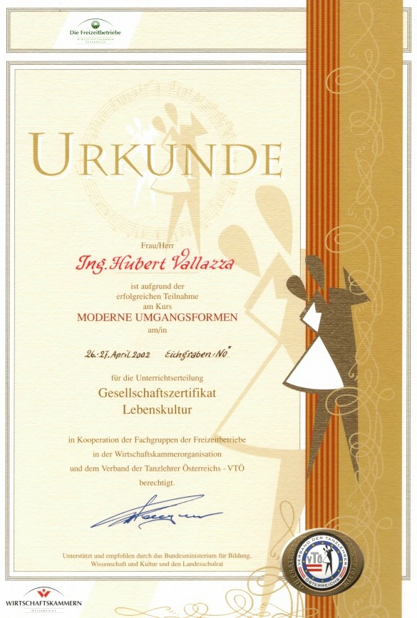 „Sicher“ wollen die Jugendlichen sein, „Stil haben“, egal ob auf der Tanzfläche bei trendigen Salsa-Rhythmen oder auf dem gesellschaftlichen und beruflichen Parkett. „Aus meiner Erfahrung als Unternehmer und Politiker weiß ich, dass es eine notwendige Voraussetzung ist, die Benimm-Regeln sowohl im Privat- als auch im Berufsleben zu beherrschen" - diese Aussage stammt aus berufenem Mund eines prominenten Mitgliedes der Österreichischen Unternehmerlandschaft. Die österreichischen Tanzschulen haben diese Notwendigkeit erkannt und setzen dies mit dem Gesellschaftszertifikat Lebenskultur in hervorragender Weise um. Als zertifizierte Tanzschule bieten auch wir für alle, die nach dem Grundsatz: